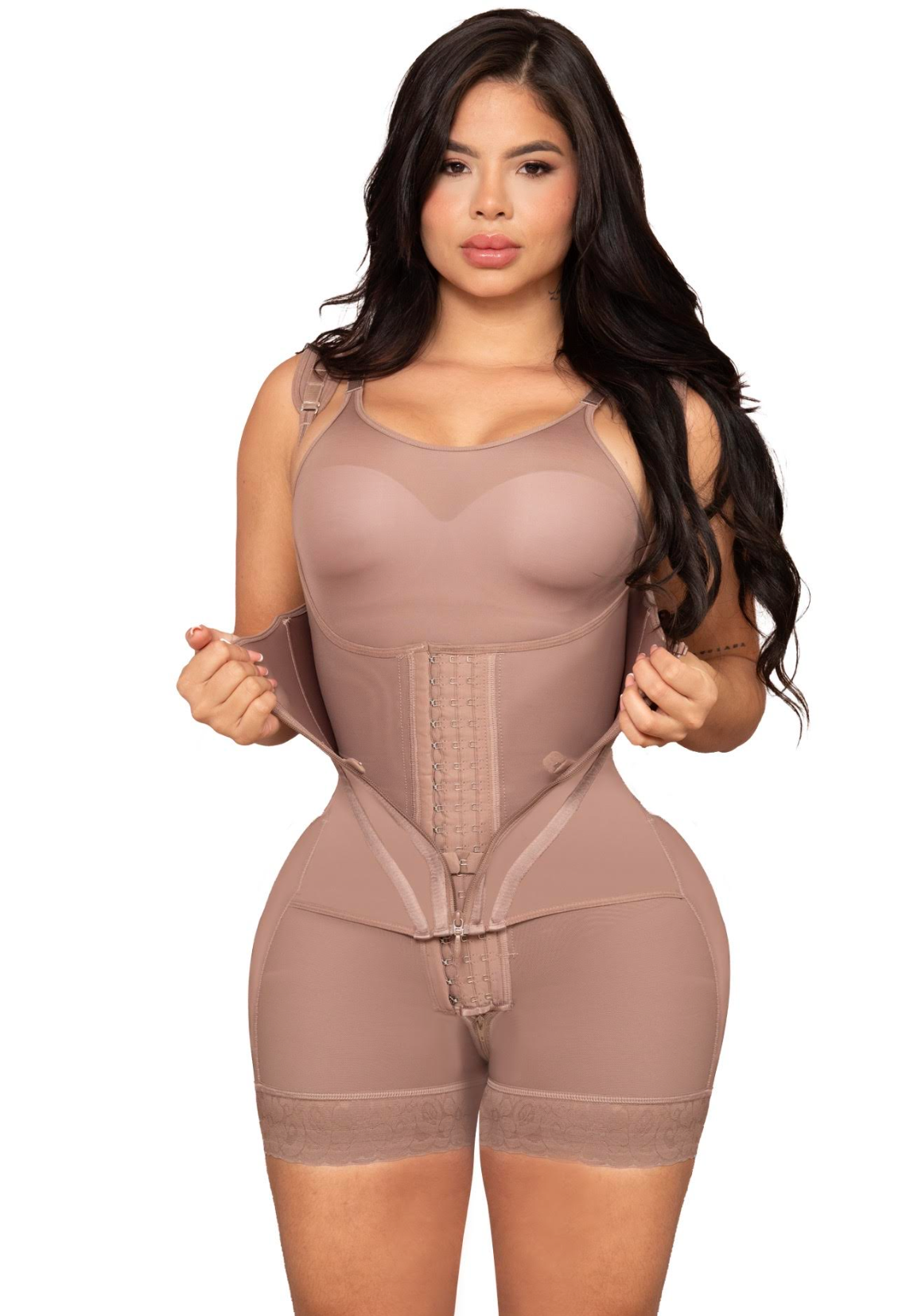 This full-body faja is designed for maximum sculpting and support. It features short-length legs and three rows of hooks for adjustable compression. The built-in waist trainer with 13 metal rods enhances your curves and provides firm control where you need it most. With full back coverage, it smooths your silhouette from every angle, helping you achieve that snatched, hourglass look while keeping you comfortable and supported all day.